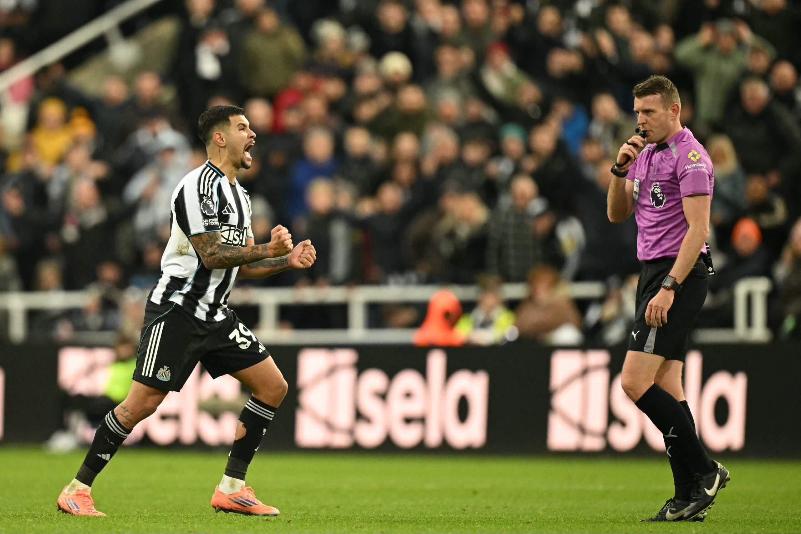 Bruno Guimaraes celebrates Newcastle United’s 2-1 win against Manchester United in November as referee Sam Barrott blows the final whistle