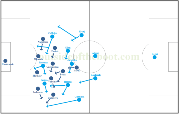 “Luciano Spaletti’s initial plan of a low block was securing the 10 (by occupying Napoli’s 6), defended the defensive third using a 4-4-1-1/4-5-1 basic formation, and blocking Napoli’s use of the diagonal passing lane from the left half space into the box. Borja Valero, Inter’s number 10, would join the central midfield duo to secure the area around Inter Milan’s midfield line. …” Outside of the Boot