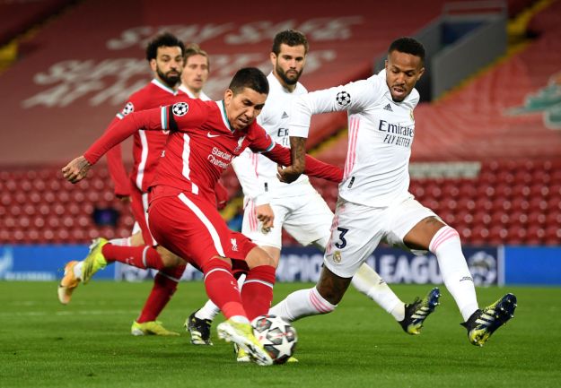 Roberto Firmino of Liverpool shoots while under pressure from Éder Militão of Real Madrid during the UEFA Champions League quarter-final second-leg match on April 14, 2021 in Liverpool, England.