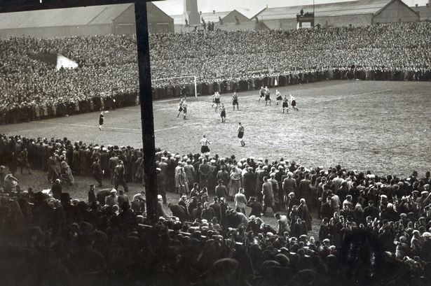 The 1939 FA Cup semi-final between Grimsby Town and Wolves carries on after the crowd had been on the pitch at Old Trafford.
