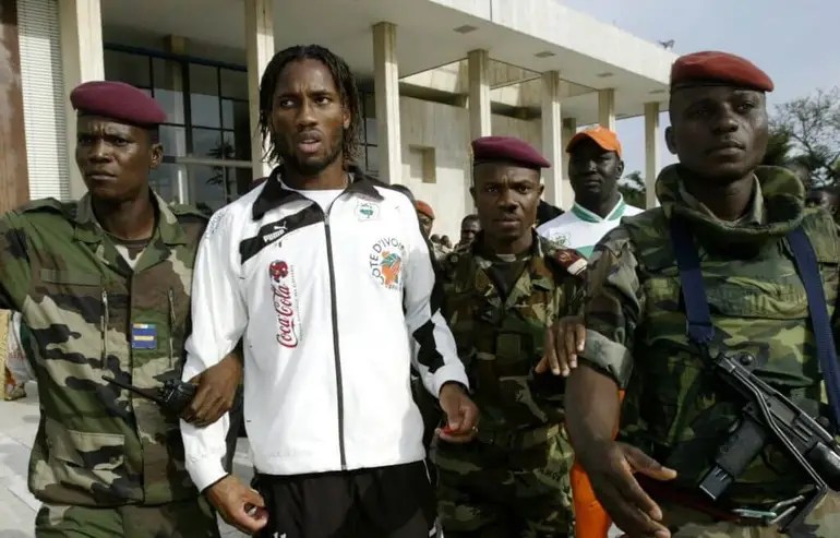 Didier Drogba leaves the presidential palace in October 2005 after a ceremony to celebrate World Cup qualification