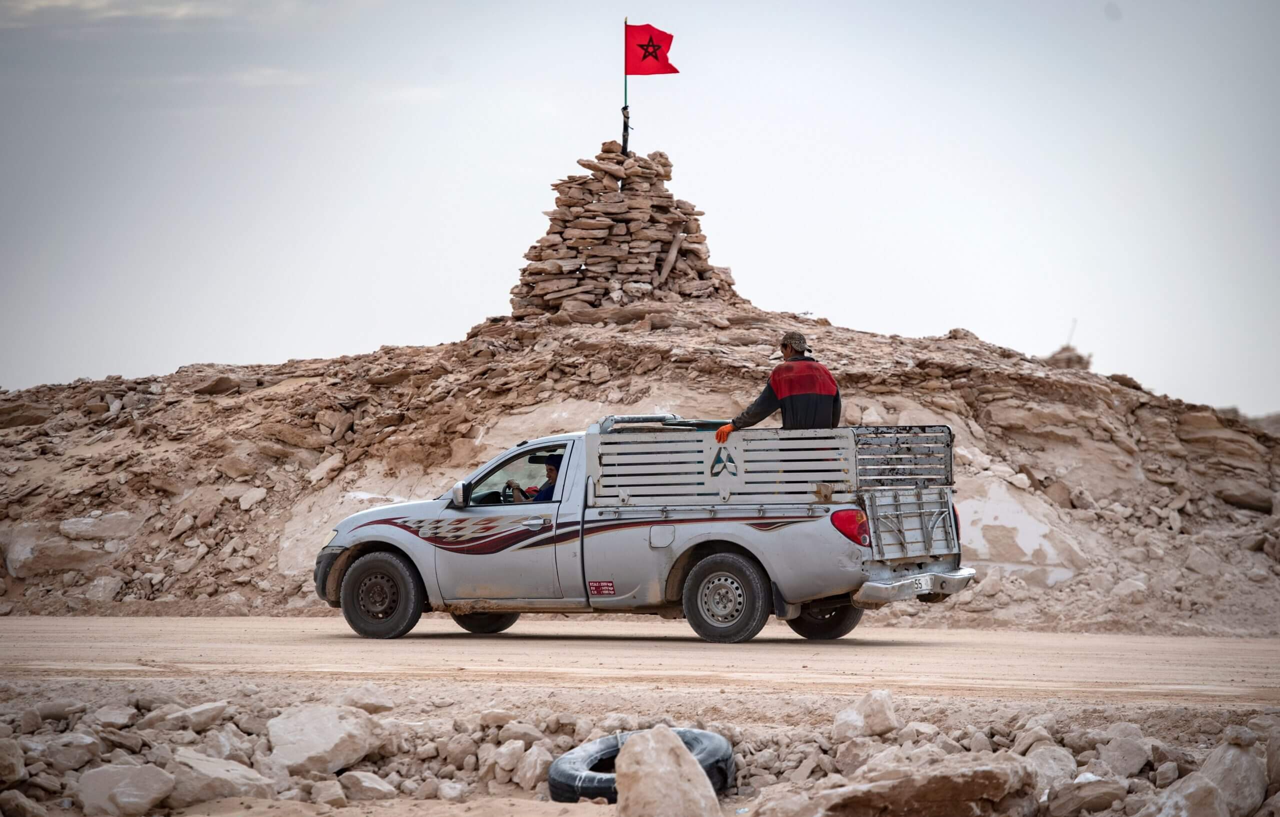 A truck passes by a hilltop manned by Moroccan soldiers on a road between Morocco and Mauritania in Guerguerat, Western Sahara, in 2020.