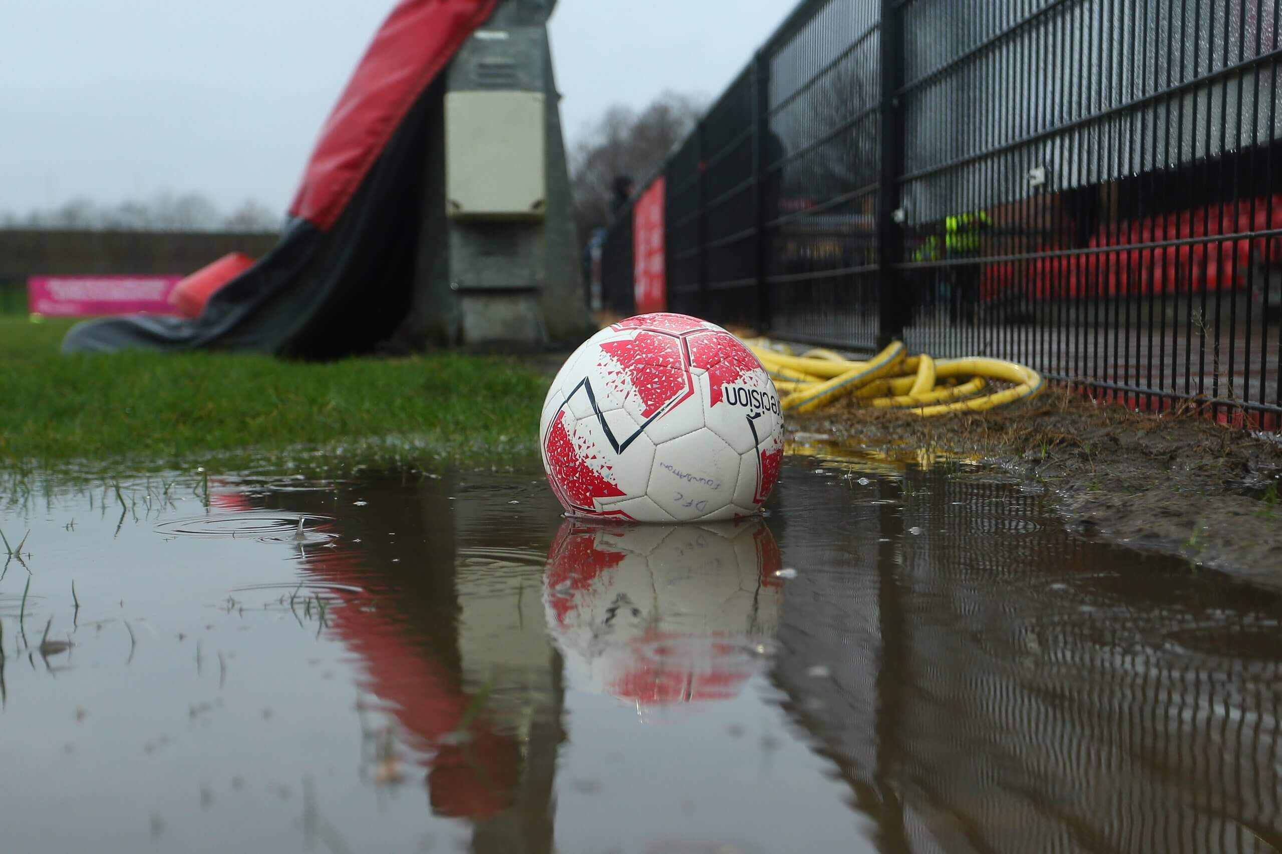 A ball in a puddle after Darlington’s home game against Scarborough Athletic at Blackwell Meadows in December 2023