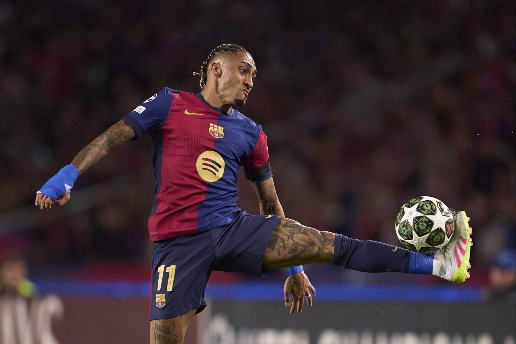 Raphinha controls the ball in a match for Barcelona