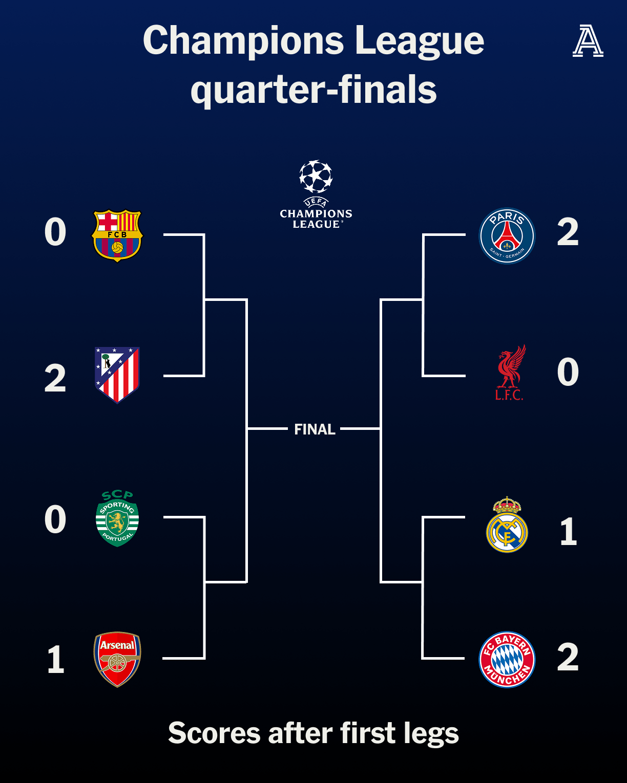 “It’s the halfway stage of the Champions League quarter-finals, which is the perfect time to pause for breath to reflect. In football parlance, the job is only ‘half done’ for Bayern Munich, Paris Saint-Germain, Arsenal and Atletico Madrid, all of whom go into the second leg next week with a lead. As for Real Madrid, Liverpool, Sporting CP and Barcelona, they ‘have it all to do’ to reach the last four. …”