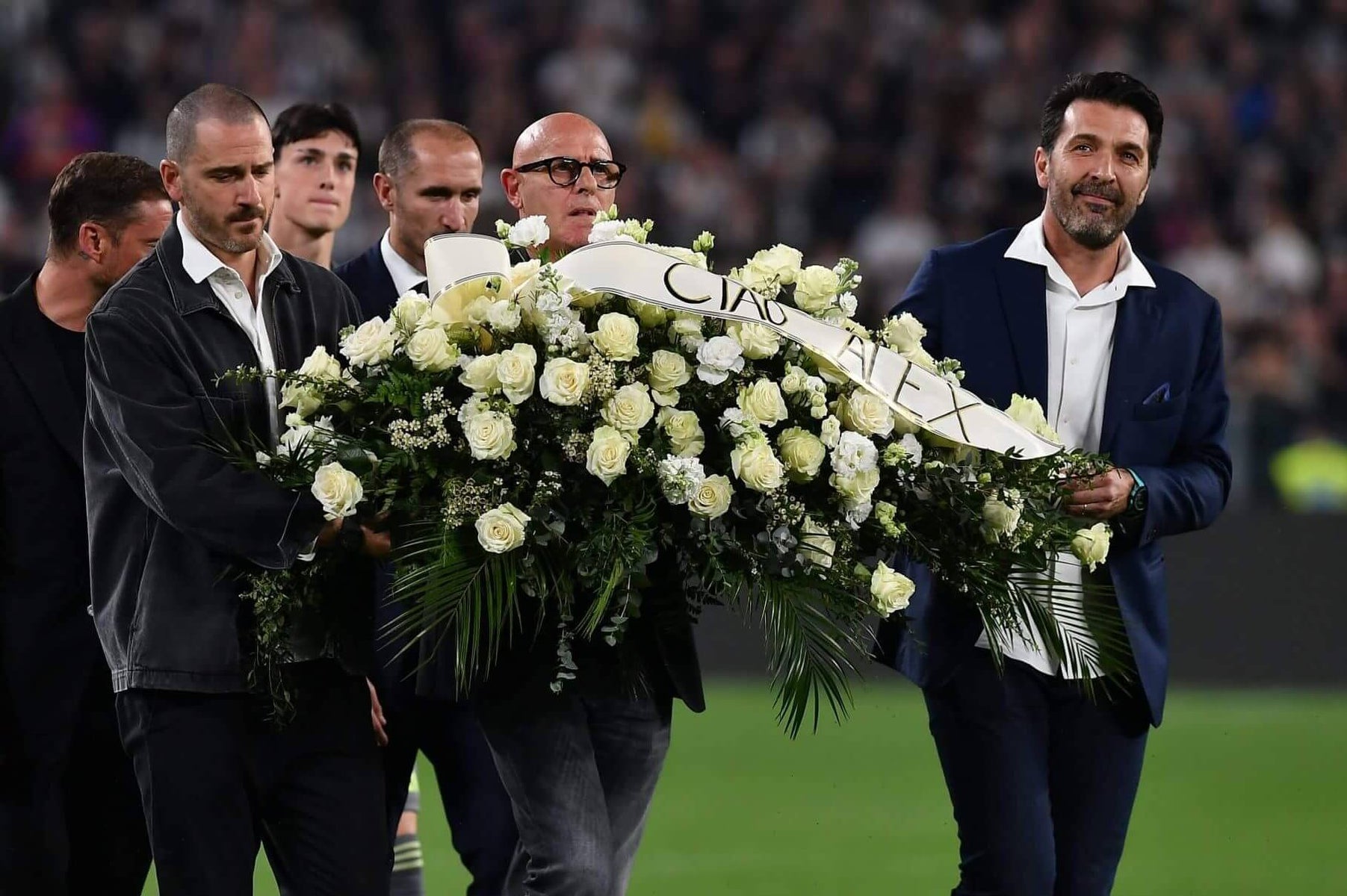<Gianluigi Buffon, right, Leonardo Bonucci, left, and other former Juventus stars carry a wreath for ex team-mate Alex Manninger