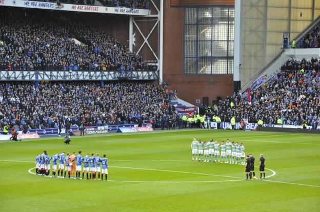 Celtic and Rangers players observe a moment of silence before their match on December 29, 2018
