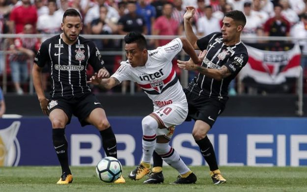 Cueva of Sao Paulo vies the ball with Maycon (L) and Gabriel of Corinthians during the match in the Brasileirao Series A 2017 at Morumbi Stadium.