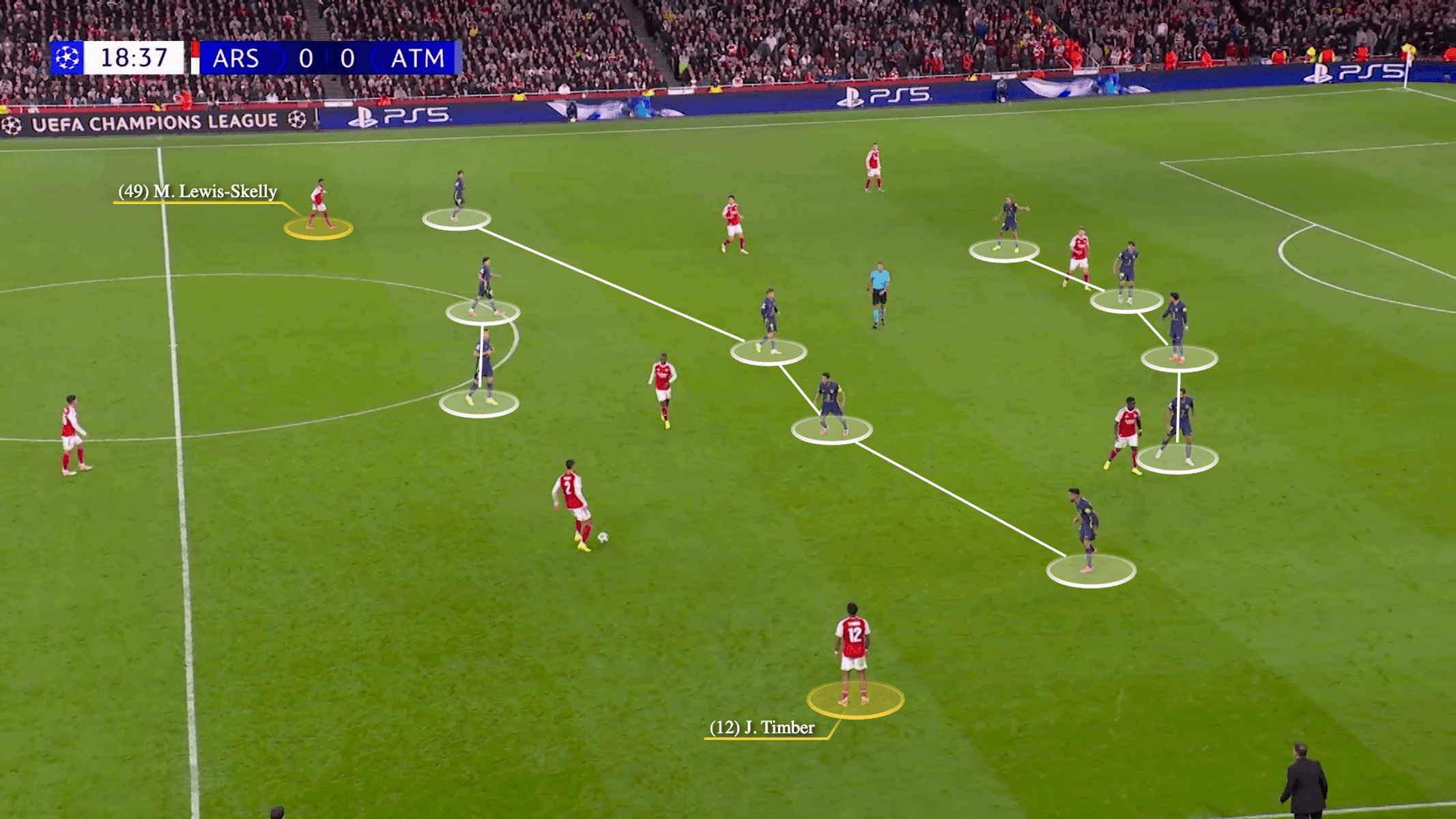 “This season, Arsenal’s in-possession shape has mainly featured a dynamic box midfield, with the left-back roaming inside to complete it, or providing width to allow Leandro Trossard or Eberechi Eze to operate in a left-sided attacking midfield role. But on Tuesday, they constantly occupied the full-back space, with Bukayo Saka and Gabriel Martinelli attacking down the flanks. In the 4-0 win against Diego Simeone’s Atletico Madrid, Arsenal’s shape on the ball resembled a 4-3-3 with narrow full-backs, and when Myles Lewis-Skelly roamed inside the pitch, Declan Rice shifted to occupy the left-back space. Atletico’s out-of-possession shape, meanwhile, oscillated between a 4-4-2 and a 5-3-2, with Giuliano Simeone dropping to become the right wing-back. …”