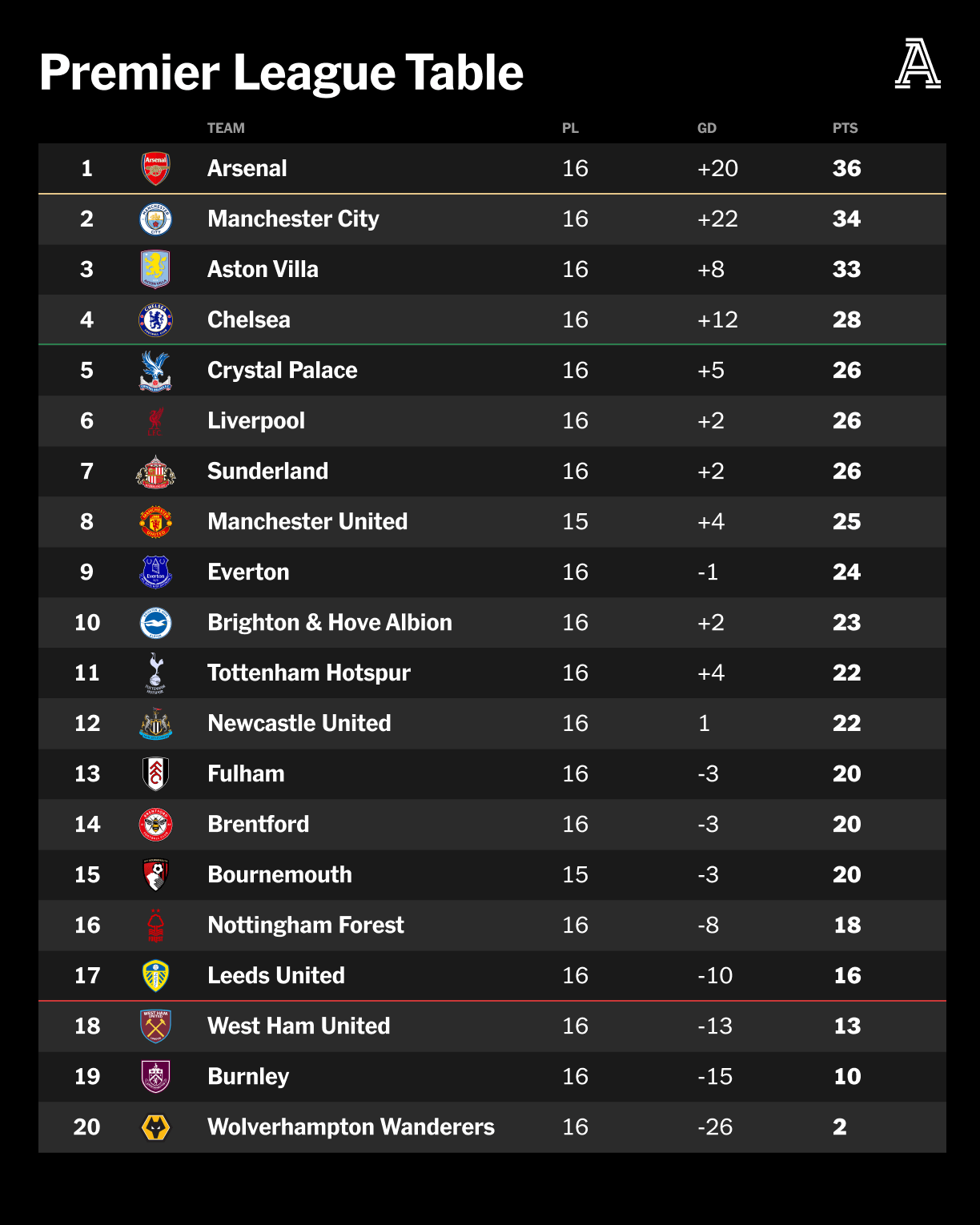 “This was the weekend when Sunderland ended Arsenal’s run of 10 consecutive wins (and eight straight clean sheets) in all competitions and Manchester City made a significant step forward in the Premier League by taking a hammer to Liverpool’s title hopes, while victories for West Ham United and Nottingham Forest left Wolverhampton Wanderers adrift at the bottom of the table. Here we will ask whether the Premier League is now looking like a two-horse race — as opposed to a three-horse race or indeed an Arsenal procession — whether Sunderland can keep defying expectations and gravity and whether Rob Edwards is making a terrible mistake if he leaves promotion-chasing Middlesbrough for doomed-looking Wolves. …”
