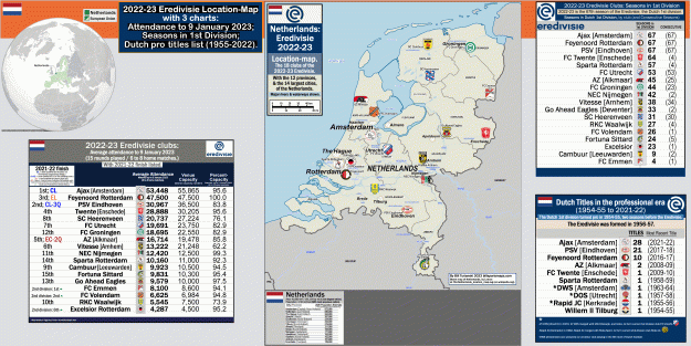 Netherlands: 2022-23 Eredivisie – Location-map, with 3 charts