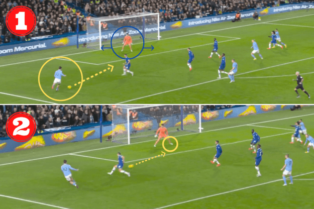 “… There has been a big improvement in Kepa Arrizabalaga’s performances since Graham Potter and his staff took over at Chelsea but he was at fault for Riyad Mahrez’s winner for Manchester City. He failed to cut out Jack Grealish’s cross and Mahrez snuck in at the back post ahead of Marc Cucurella to finish. Where did it all go wrong? Arrizabalaga’s initial positioning was good. He was facing the ball but slightly angled with his body open to see the play in front of him. He was almost in the sweet spot of being aggressive off his line to cut out the cross, yet close enough to his near post should Grealish try and sneak one past him. …”